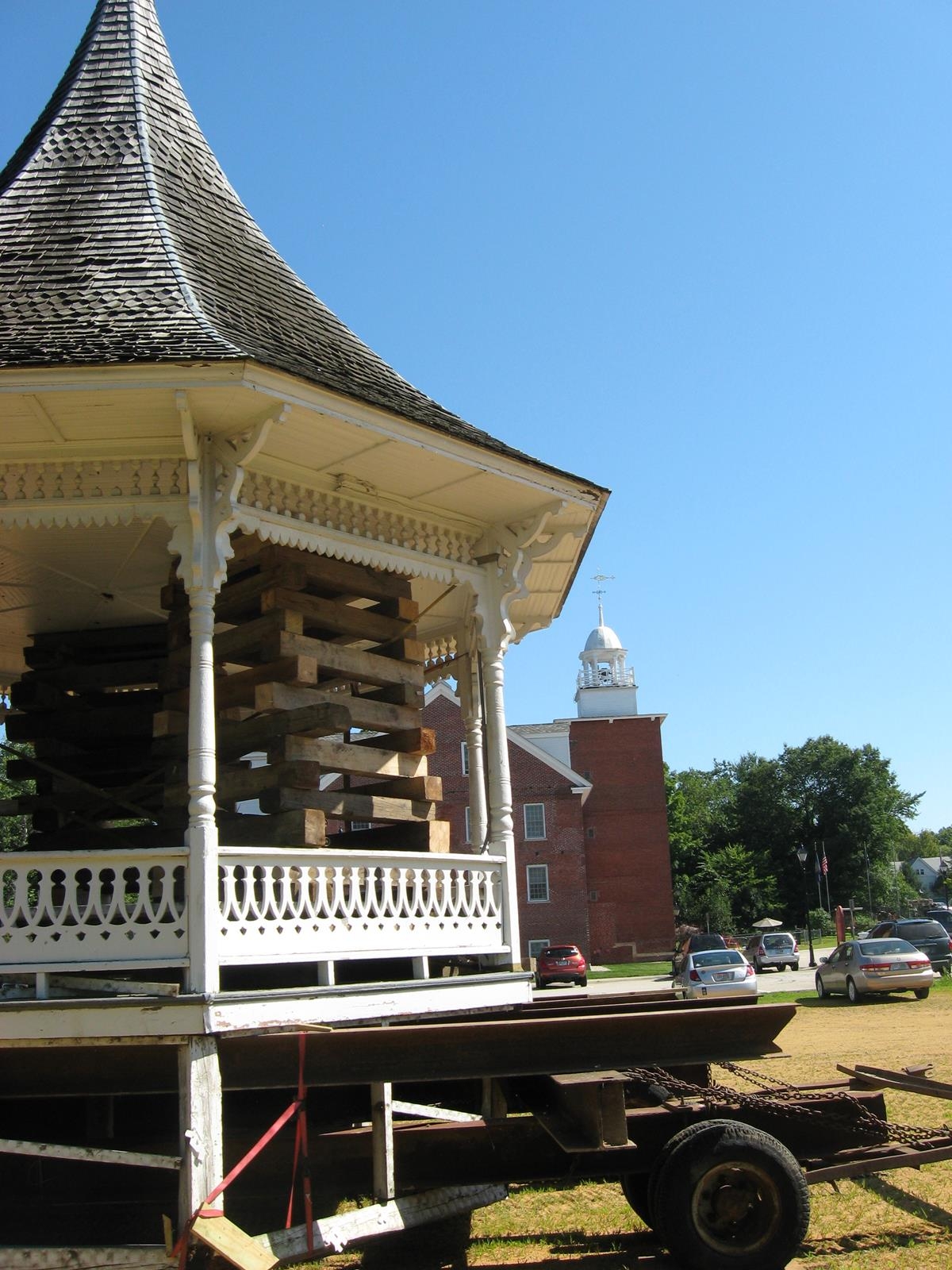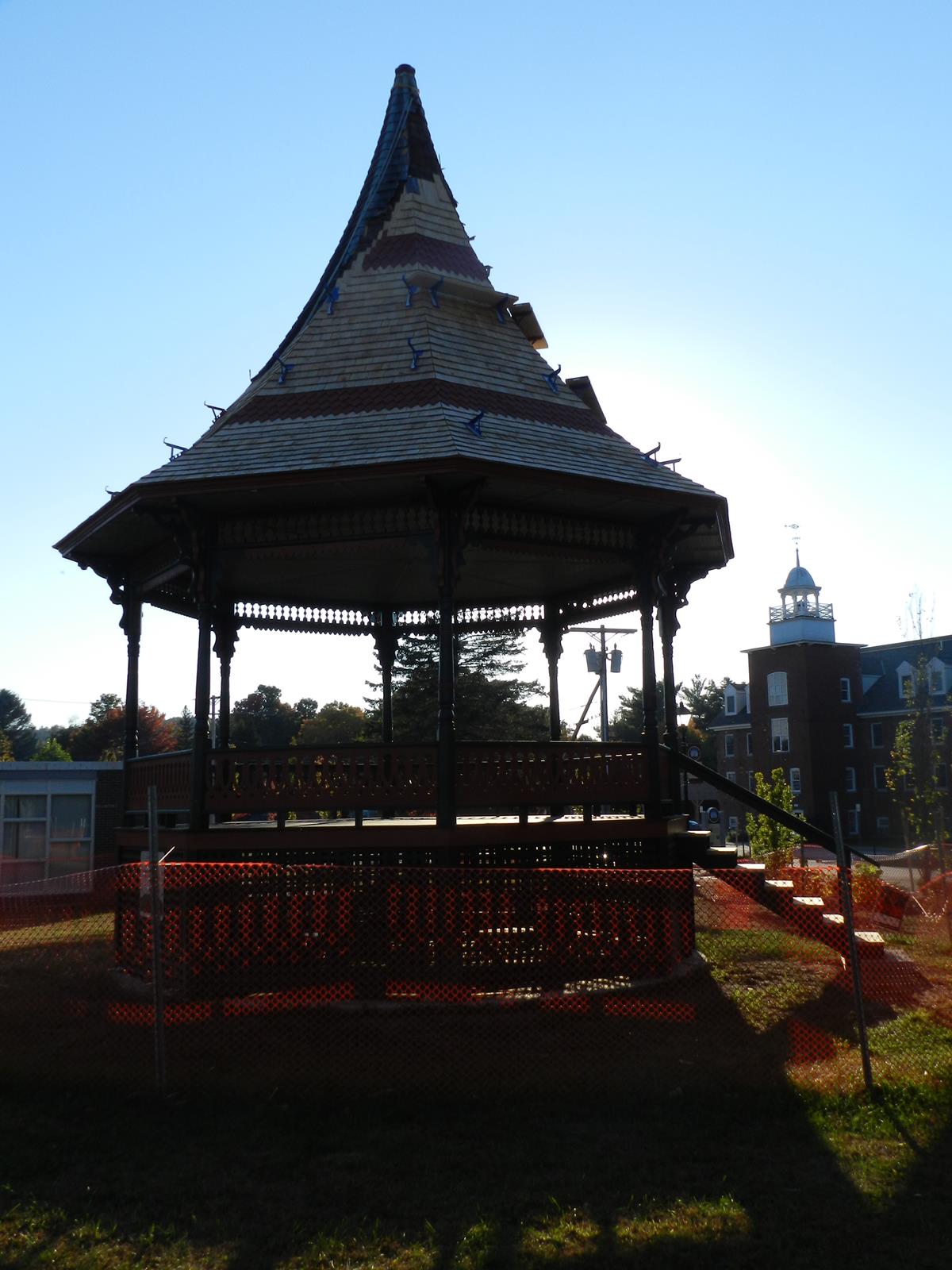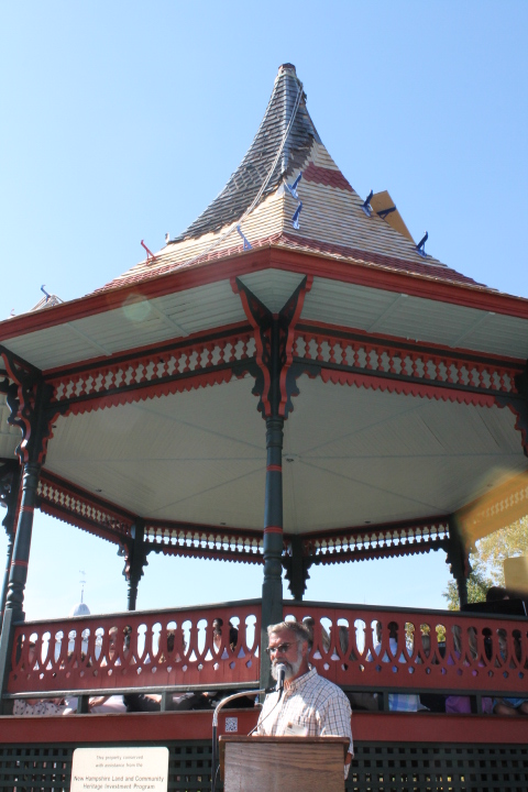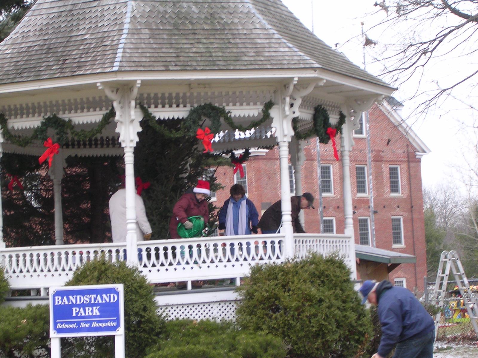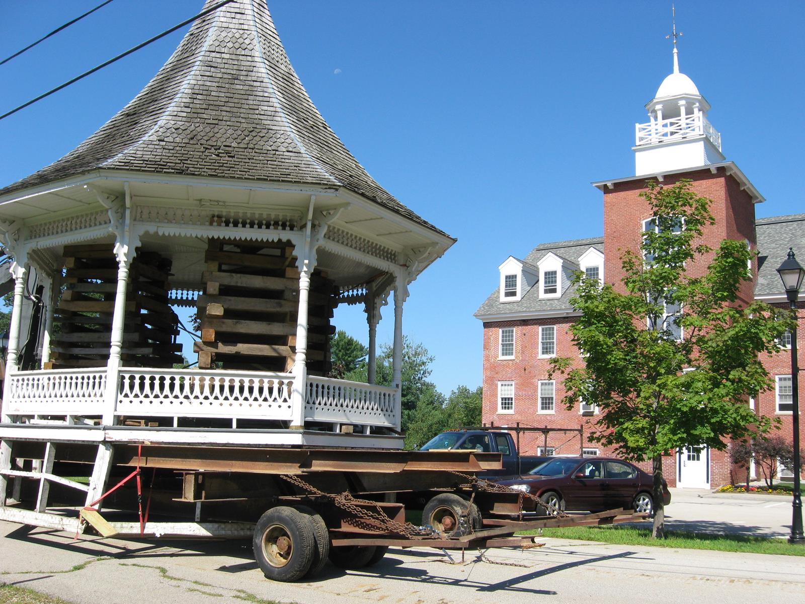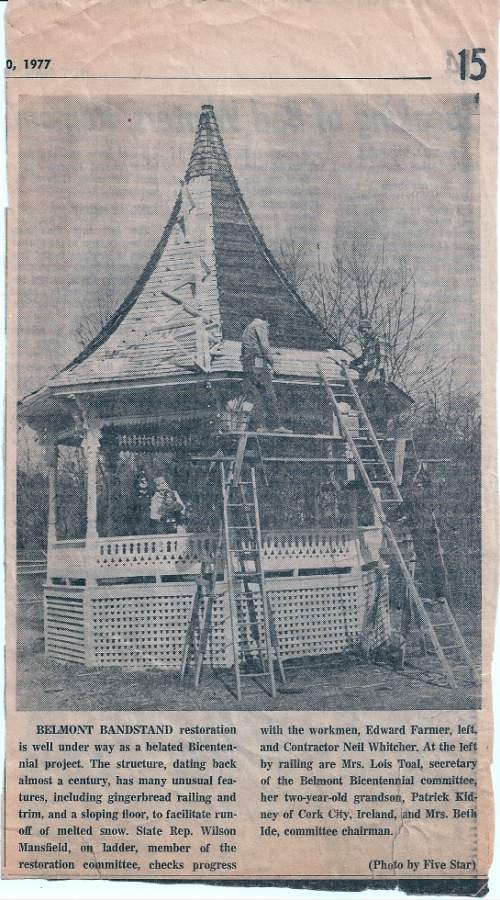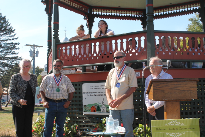 Belmont Heritage Commission and principal restoration team gathered at the landmark New Hampshire Bandstand to review final needs before a first June 6th concert program (left to right) Alyce Jewell, Priscilla Annis – secretary, Wallace Rhodes – vice chairman, Vicki Donovan, restoration contractor JR Graton, historic painting specialist John Thompson and Eric Richardson of JLT Painting, Linda Frawley – chairman. (Not present for photo were Heritage Commission member Shayne Duggan and Selectmen’s representative Ron Cormier.) May 2015