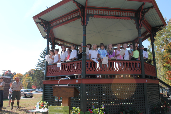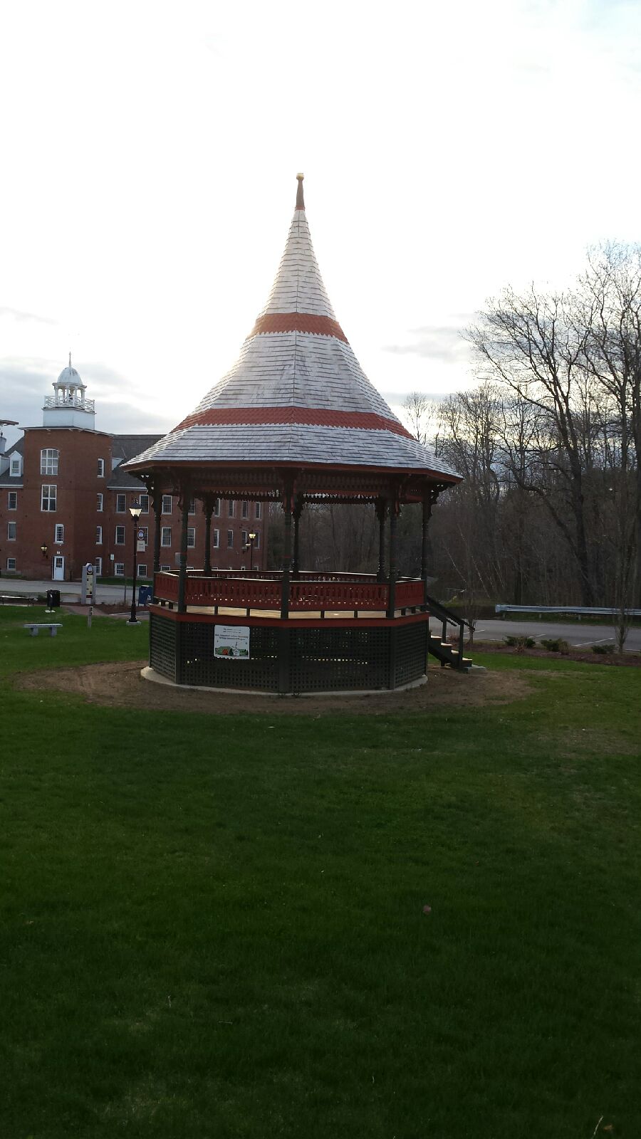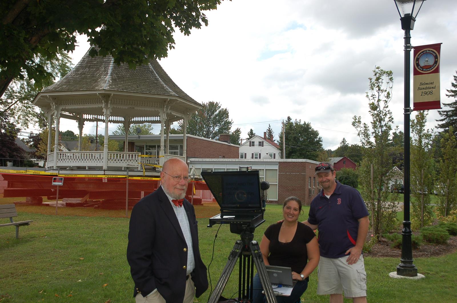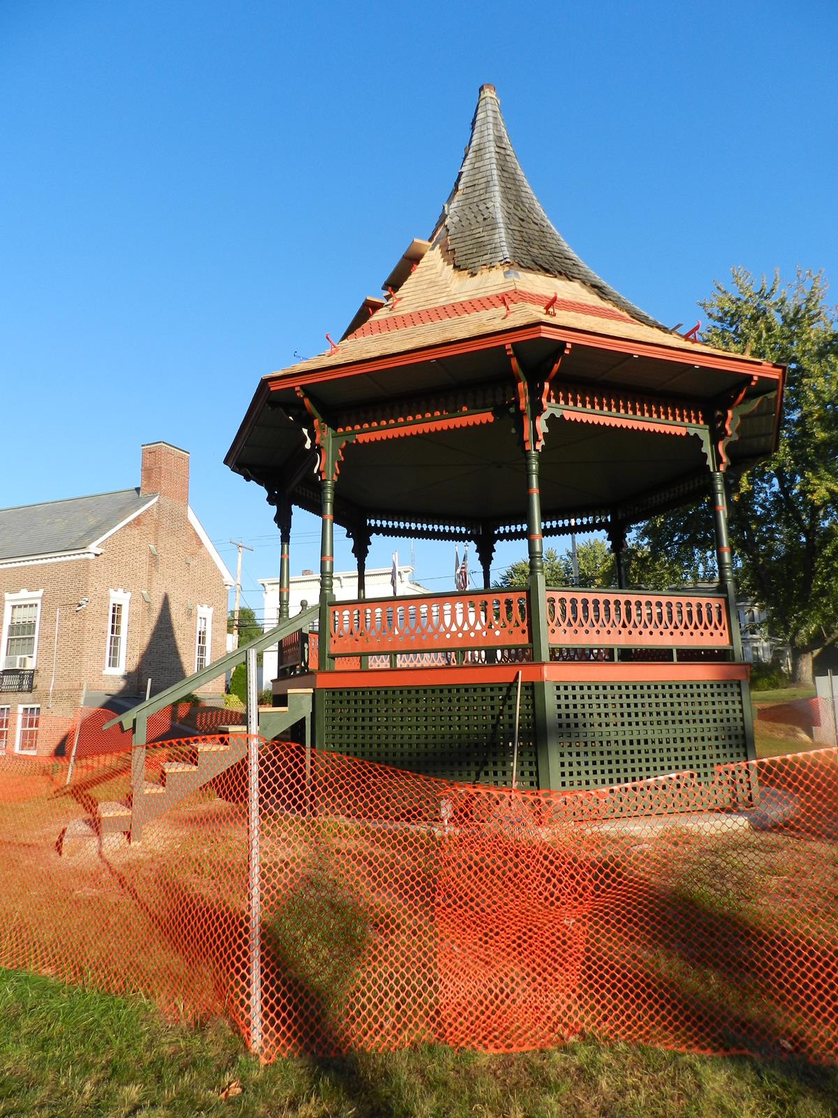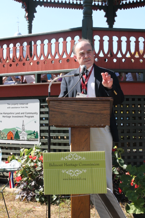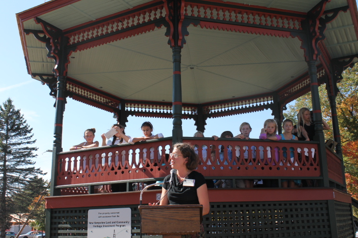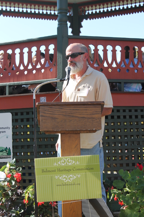 Belmont Heritage Commission and principal restoration team gathered at the landmark New Hampshire Bandstand to review final needs before a first June 6th concert program (left to right) Alyce Jewell, Priscilla Annis – secretary, Wallace Rhodes – vice chairman, Vicki Donovan, restoration contractor JR Graton, historic painting specialist John Thompson and Eric Richardson of JLT Painting, Linda Frawley – chairman. (Not present for photo were Heritage Commission member Shayne Duggan and Selectmen’s representative Ron Cormier.) May 2015