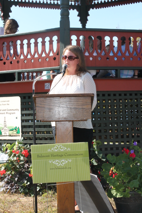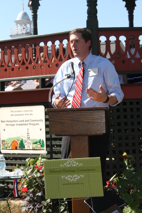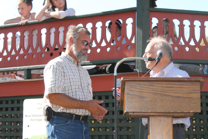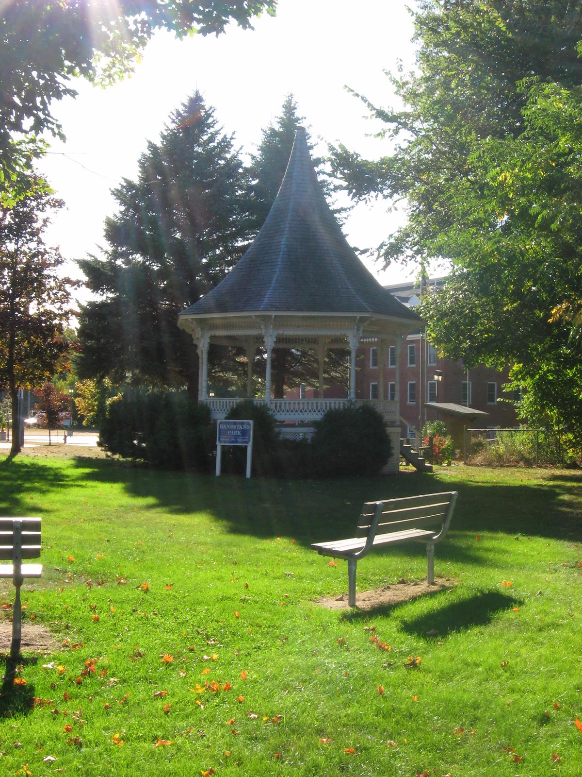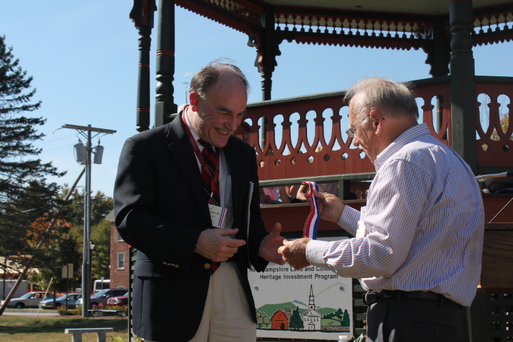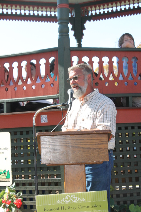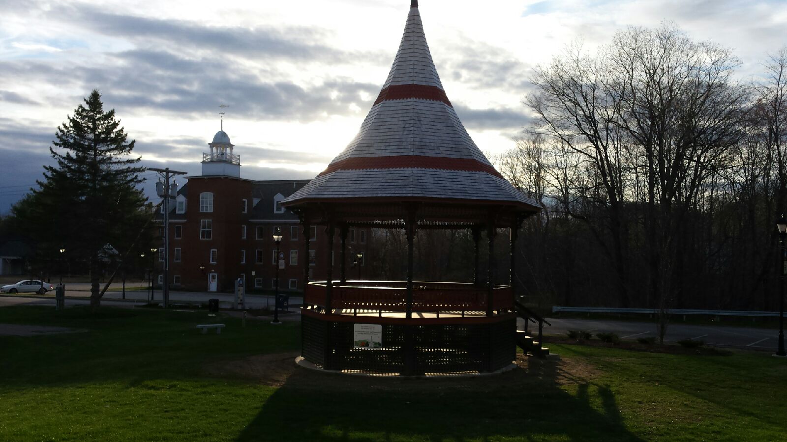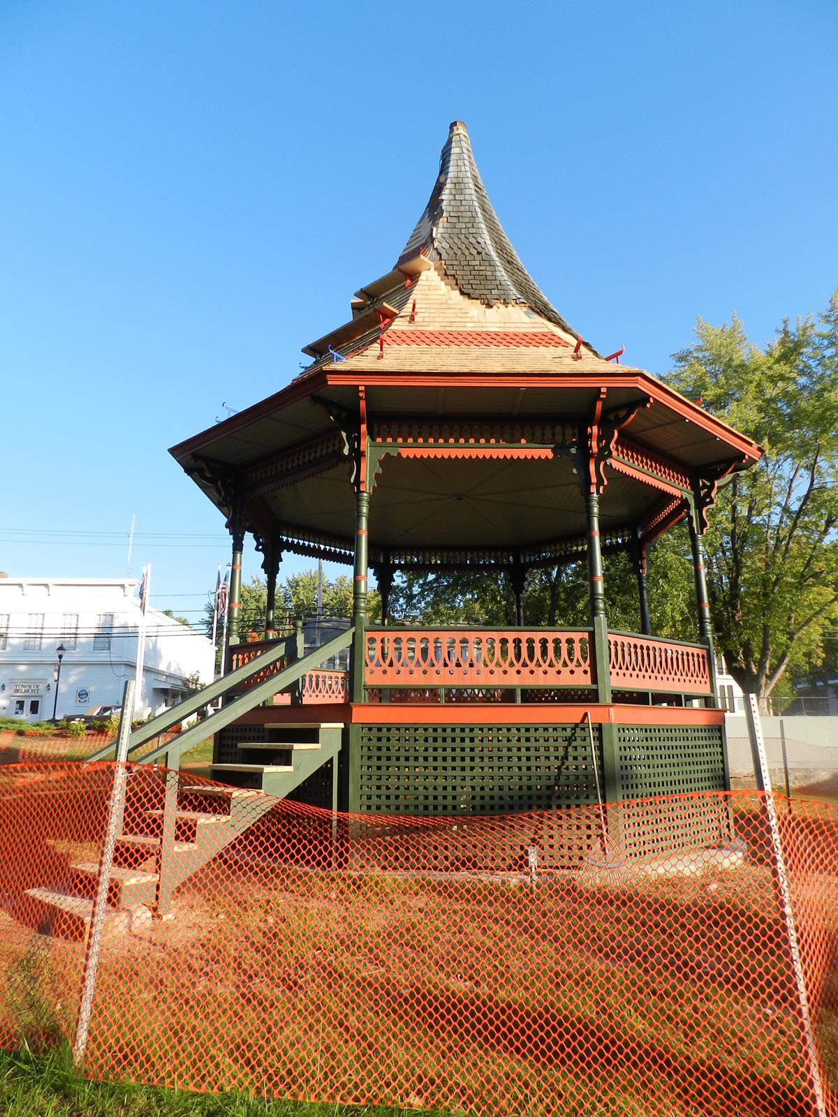 Belmont Heritage Commission and principal restoration team gathered at the landmark New Hampshire Bandstand to review final needs before a first June 6th concert program (left to right) Alyce Jewell, Priscilla Annis – secretary, Wallace Rhodes – vice chairman, Vicki Donovan, restoration contractor JR Graton, historic painting specialist John Thompson and Eric Richardson of JLT Painting, Linda Frawley – chairman. (Not present for photo were Heritage Commission member Shayne Duggan and Selectmen’s representative Ron Cormier.) May 2015