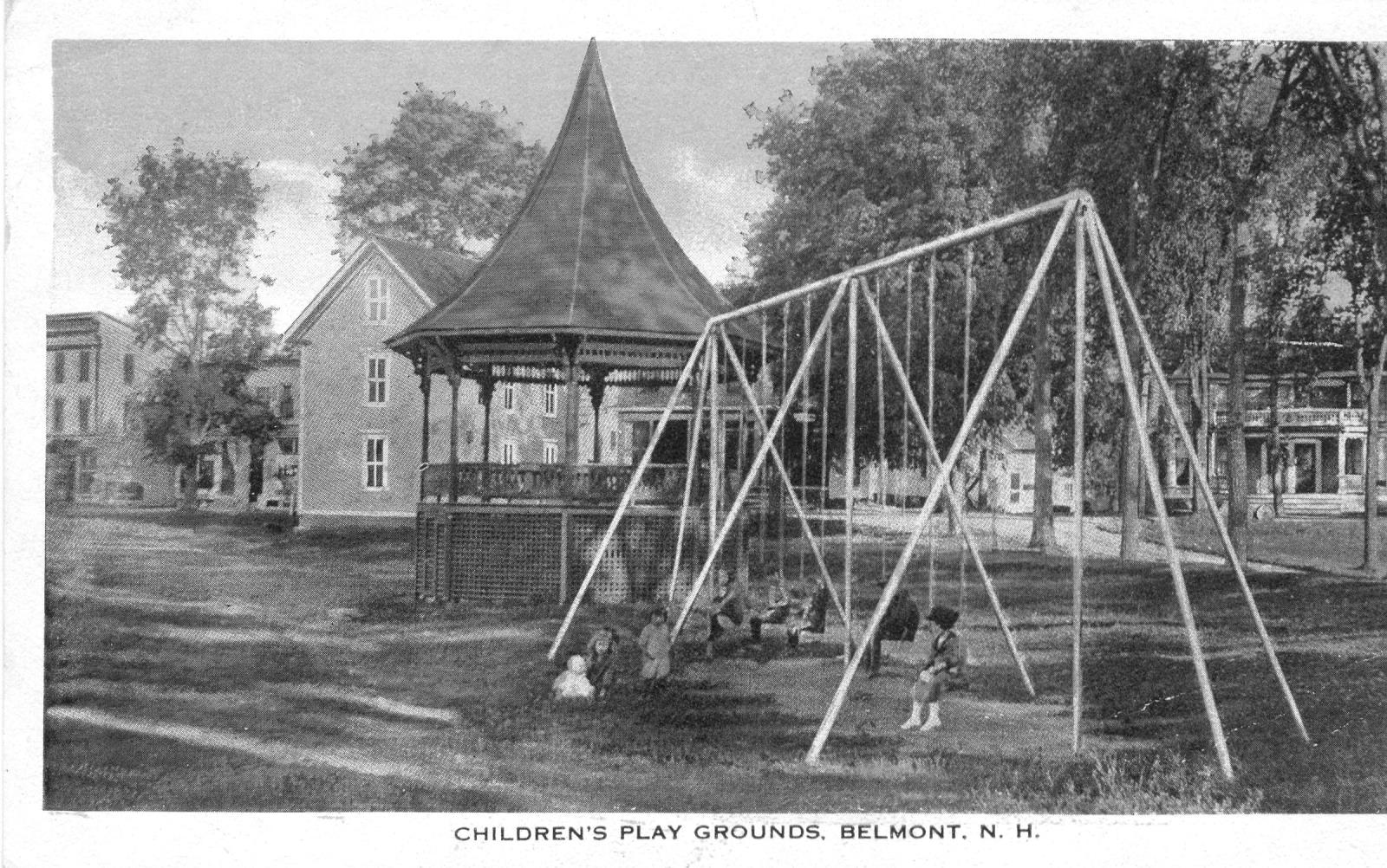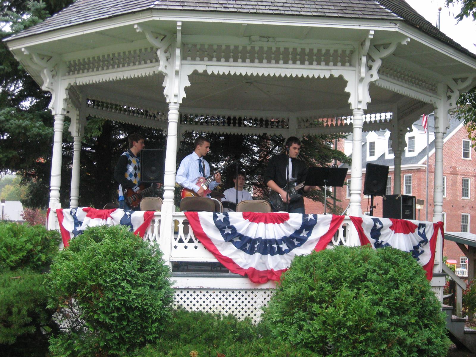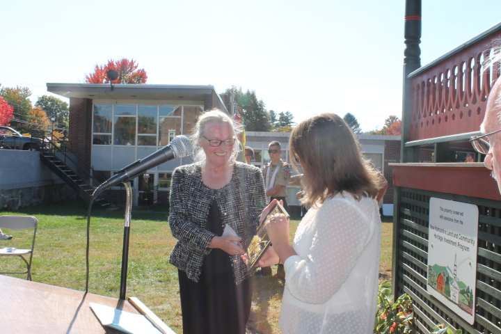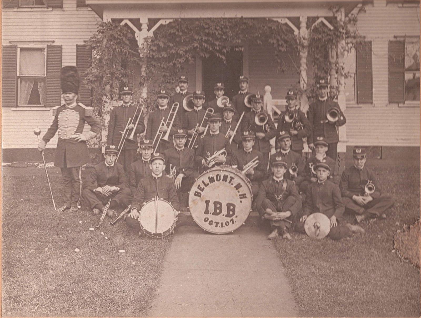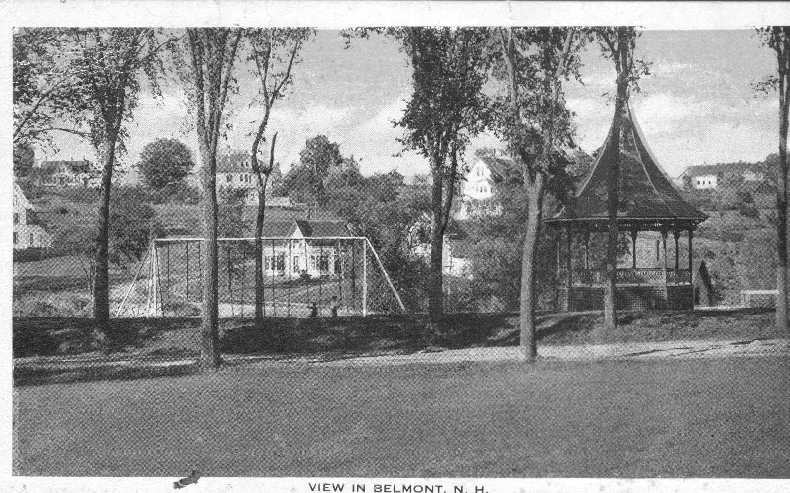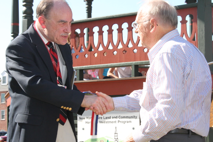 Belmont Heritage Commission and principal restoration team gathered at the landmark New Hampshire Bandstand to review final needs before a first June 6th concert program (left to right) Alyce Jewell, Priscilla Annis – secretary, Wallace Rhodes – vice chairman, Vicki Donovan, restoration contractor JR Graton, historic painting specialist John Thompson and Eric Richardson of JLT Painting, Linda Frawley – chairman. (Not present for photo were Heritage Commission member Shayne Duggan and Selectmen’s representative Ron Cormier.) May 2015