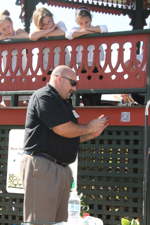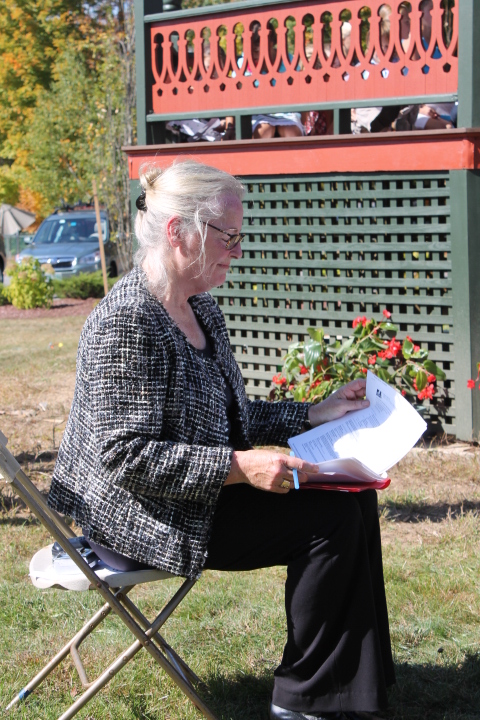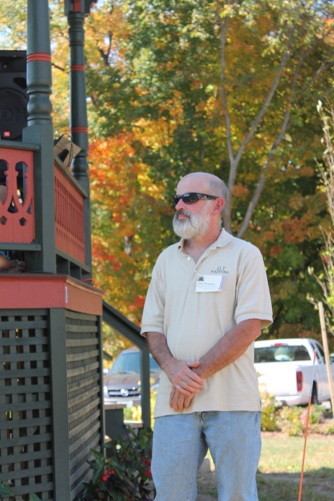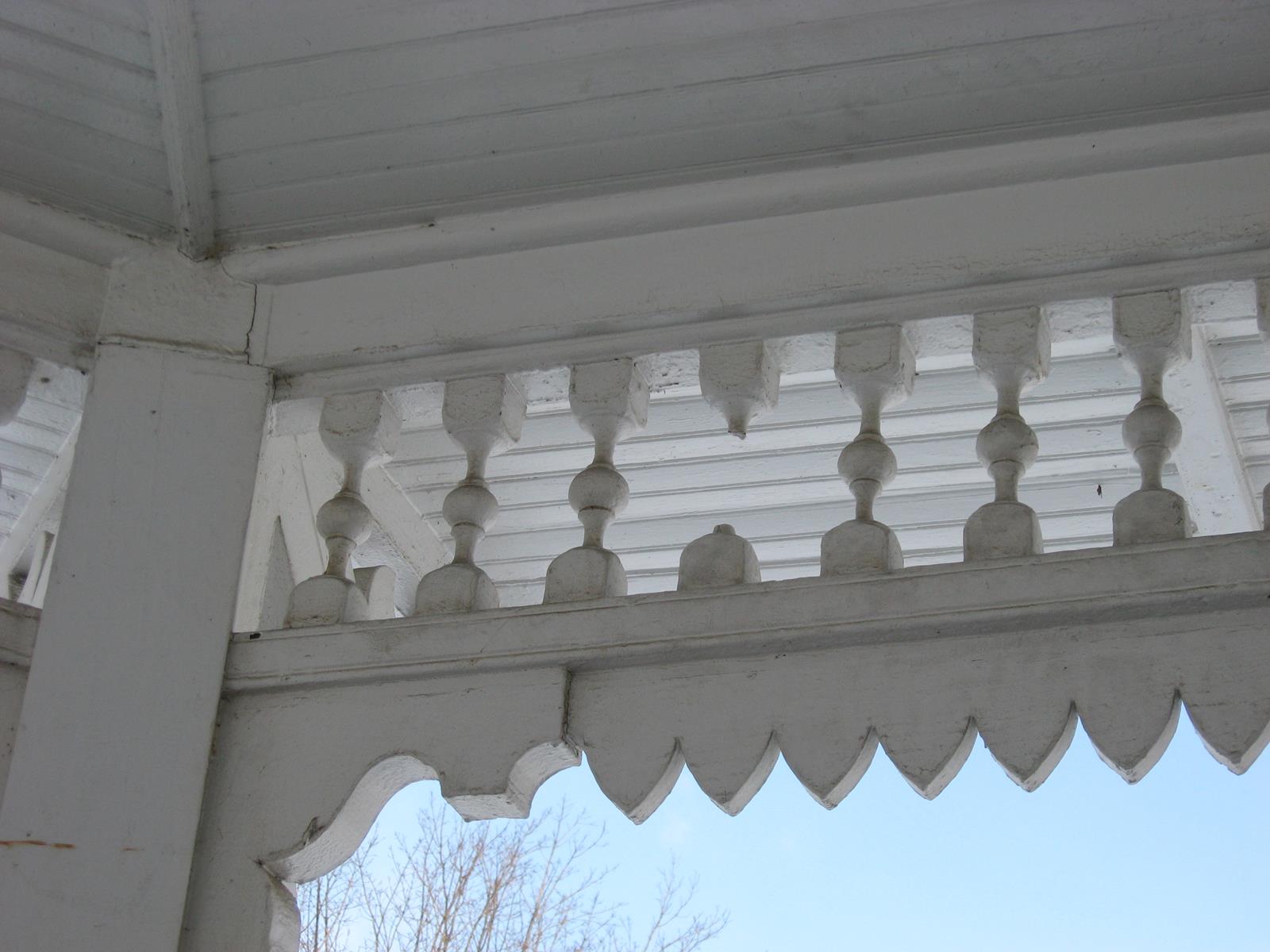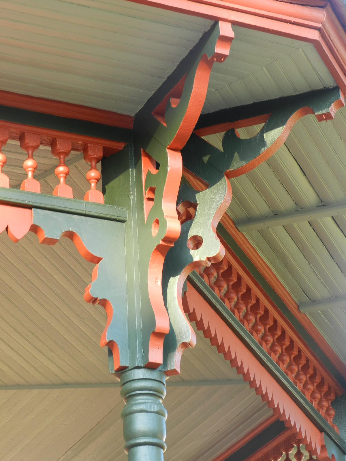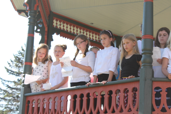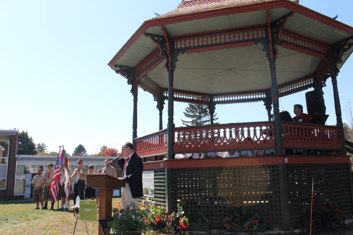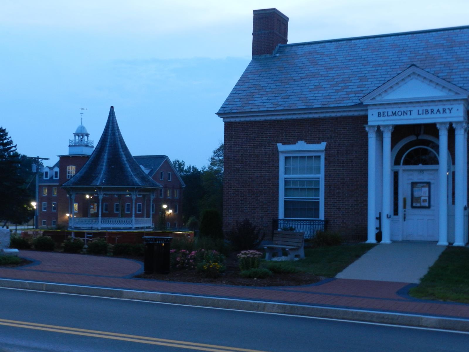Belmont Heritage Commission and principal restoration team gathered at the landmark New Hampshire Bandstand to review final needs before a first June 6th concert program (left to right) Alyce Jewell, Priscilla Annis – secretary, Wallace Rhodes – vice chairman, Vicki Donovan, restoration contractor JR Graton, historic painting specialist John Thompson and Eric Richardson of JLT Painting, Linda Frawley – chairman. (Not present for photo were Heritage Commission member Shayne Duggan and Selectmen’s representative Ron Cormier.) May 2015