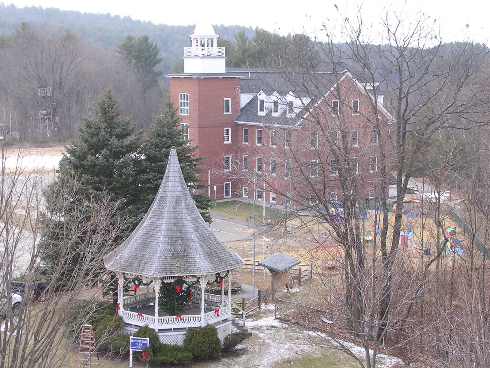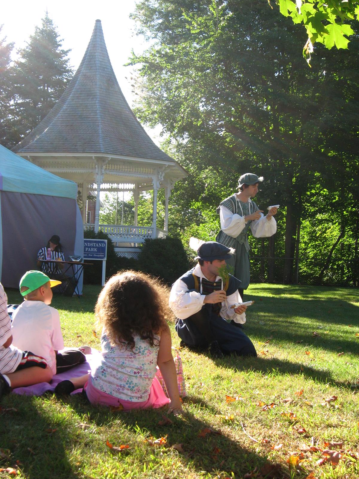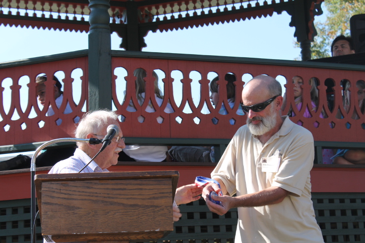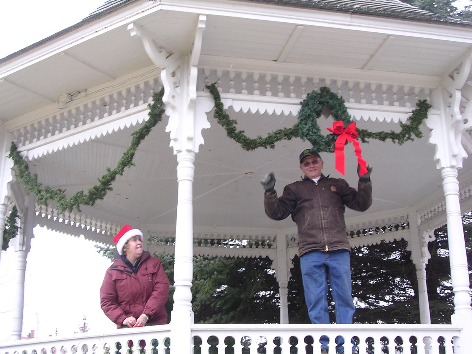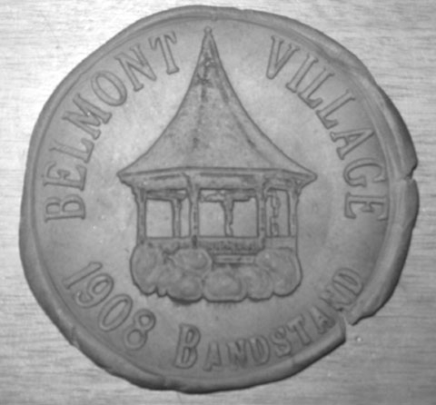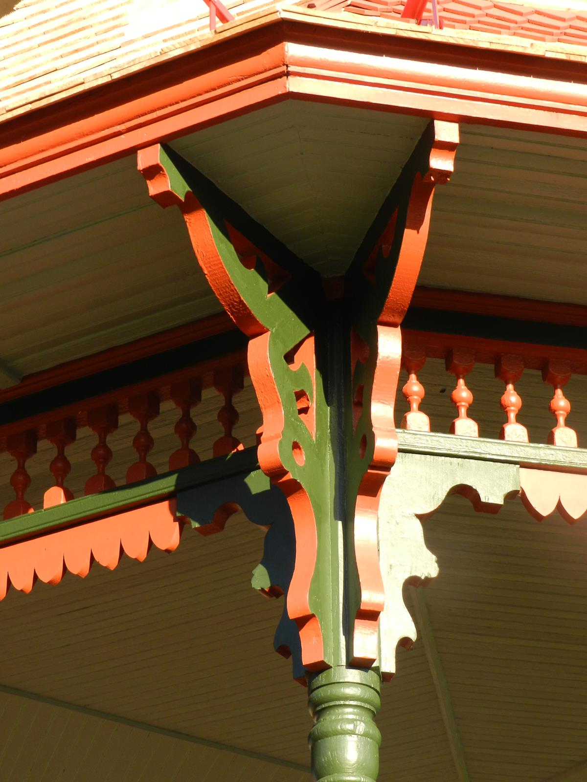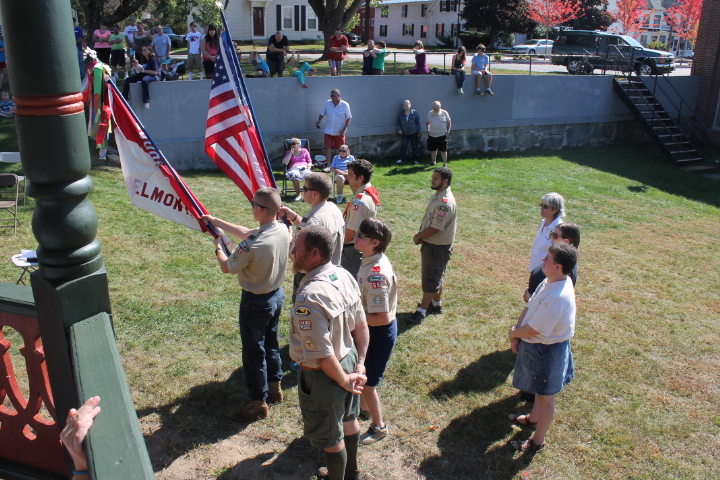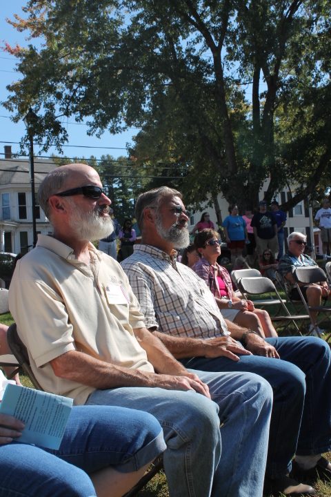 Belmont Heritage Commission and principal restoration team gathered at the landmark New Hampshire Bandstand to review final needs before a first June 6th concert program (left to right) Alyce Jewell, Priscilla Annis – secretary, Wallace Rhodes – vice chairman, Vicki Donovan, restoration contractor JR Graton, historic painting specialist John Thompson and Eric Richardson of JLT Painting, Linda Frawley – chairman. (Not present for photo were Heritage Commission member Shayne Duggan and Selectmen’s representative Ron Cormier.) May 2015