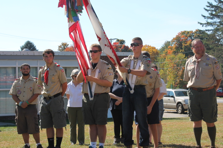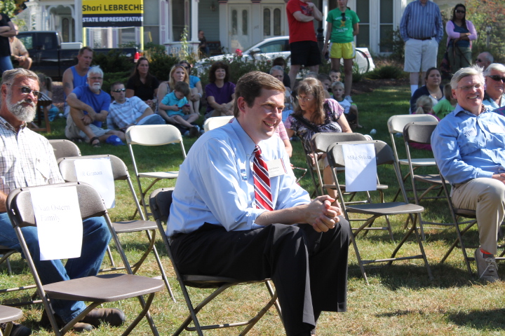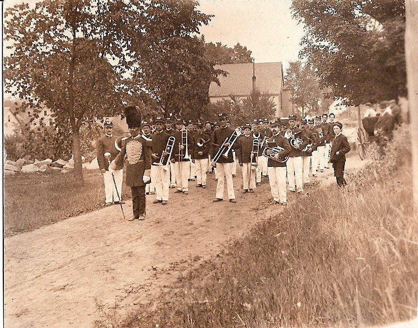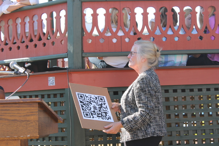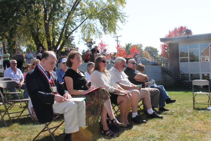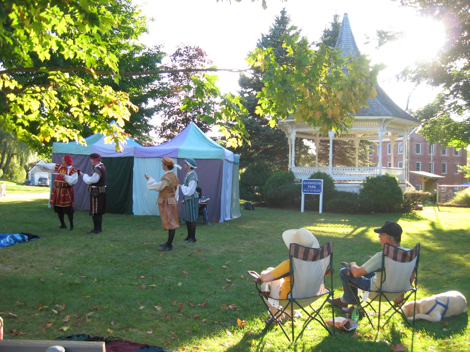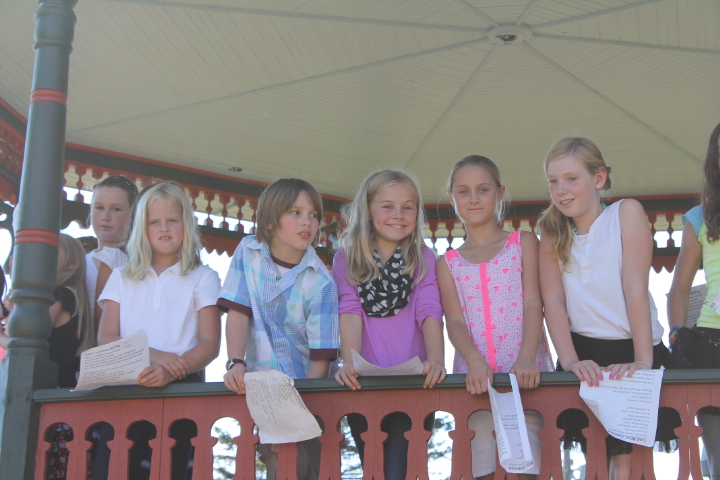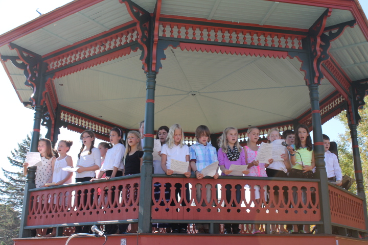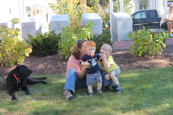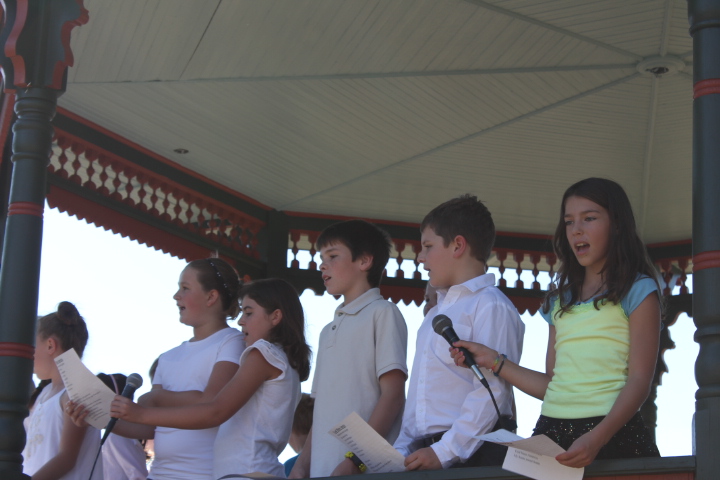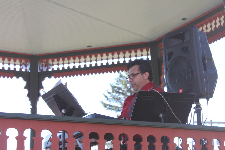 Belmont Heritage Commission and principal restoration team gathered at the landmark New Hampshire Bandstand to review final needs before a first June 6th concert program (left to right) Alyce Jewell, Priscilla Annis – secretary, Wallace Rhodes – vice chairman, Vicki Donovan, restoration contractor JR Graton, historic painting specialist John Thompson and Eric Richardson of JLT Painting, Linda Frawley – chairman. (Not present for photo were Heritage Commission member Shayne Duggan and Selectmen’s representative Ron Cormier.) May 2015